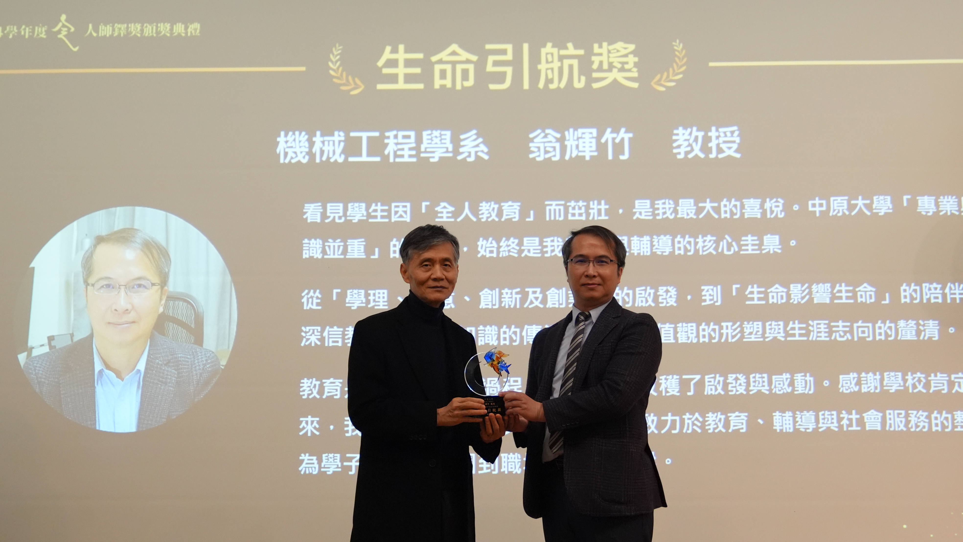 Chung Yuan Christian University inaugurated the "Holistic Mentor Award" to honor educators who excel in classroom instruction and student mentorship. The ceremony was held on December 17, 2025. Professor Huei-Chu Weng received the "Life Navigation Award," recognizing his teaching philosophy centered on "theory, creativity, innovation, and entrepreneurship." He emphasizes that professional competence and general education complement each other in cultivating well-rounded engineers. His courses have been consistently recognized by CYCU's course evaluation system. He has also received the IEET Teaching Excellence Award and Ministry of Education awards for new engineering education and energy talent cultivation. Three faculty members were honored: Assoc. Prof. Shan-Gen Jian (Potential Nurturing Award), Prof. Huei-Chu Weng (Life Navigation Award), and Prof. Chun-Chieh Chen (Holistic Legacy Award).